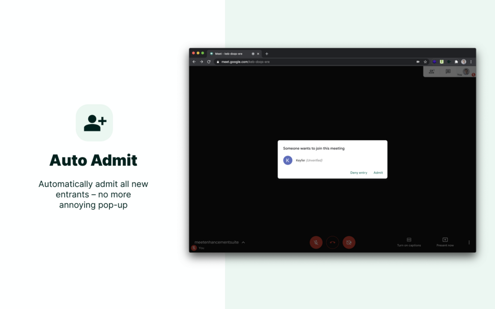 - Auto-Full Screen on Presentation: automatically sets your Meet window to full-screen when someone begins presenting